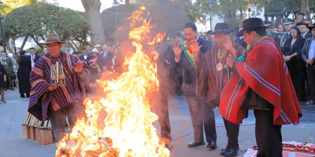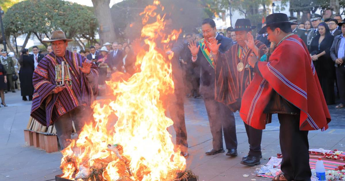 [Gobernación de Chuquisaca] / El presidente Luis Arce en el ritual que se instaló en la plaza 25 de Mayo de Sucre.