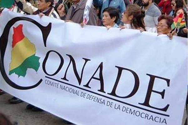 El Comité Nacional de Defensa de la Democracia (Conade) se declaró en emergencia la noche de este viernes tras un plantón que se llevó adelante en el atrio de la Catedral de la capital cruceña en el que exigieron que se anulen los juicios en marcha por el denominado caso ‘Golpe I’.