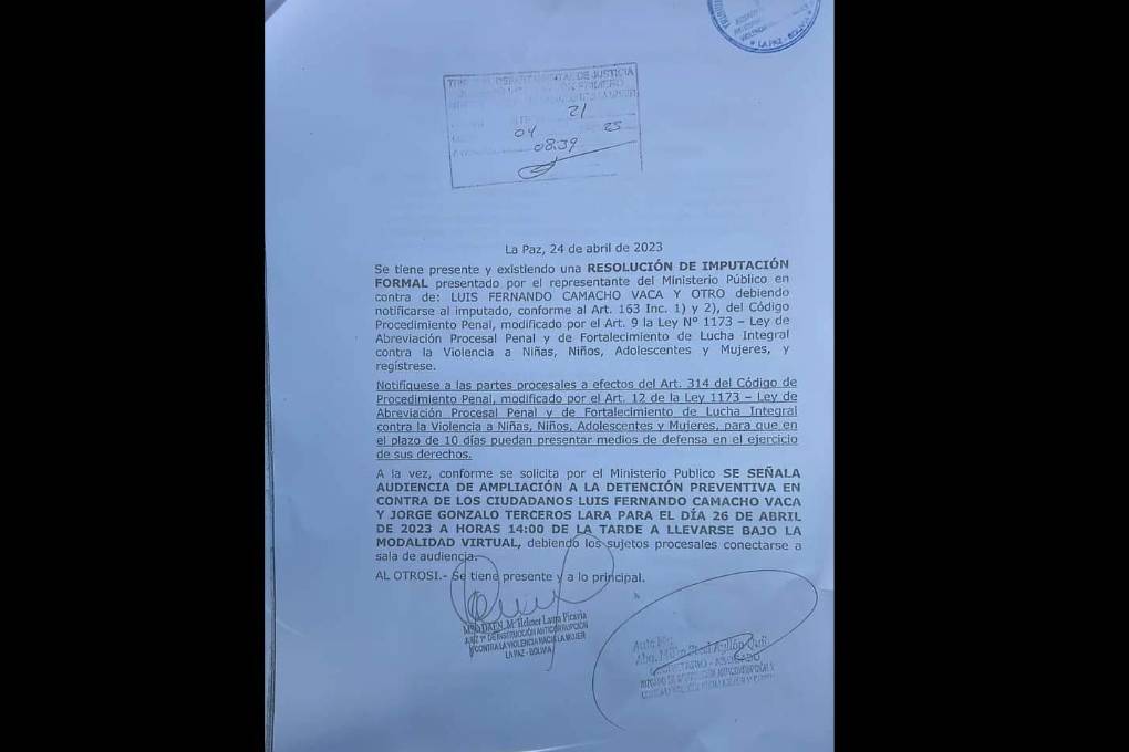 Este miércoles 26 de abril se define si se amplía o no la detención preventiva del gobernador cruceño Luis Fernando Camacho por el caso ‘Golpe I’, cuando se instale una audiencia virtual que está fijada para las 14:00. En este asunto también está incluido el excomandante de la Fuerza Aérea, Jorge Terceros, según el documento emitido por las autoridades correspondientes.