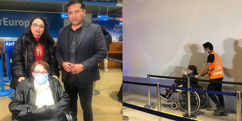 La exministra llegó en silla de ruedas al aeropuerto internacional de Viru Viru, en Santa Cruz.