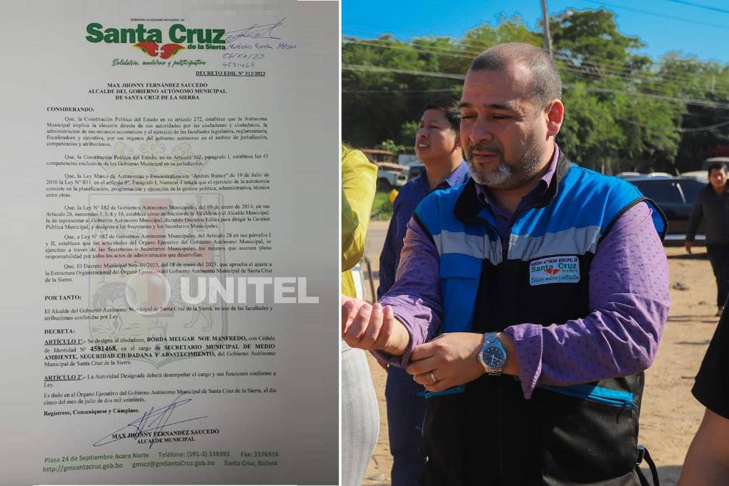 Cambios en la Secretaría Municipal de Medioambiente, Seguridad Ciudadana y Abastecimiento de la Alcaldía de Santa Cruz de la Sierra. Una fuente del Ejecutivo municipal confirmó a UNITEL que el alcalde Jhonny Fernández designó a Manfredo Borda como nueva autoridad en lugar de Juan Pablo Mazzone.