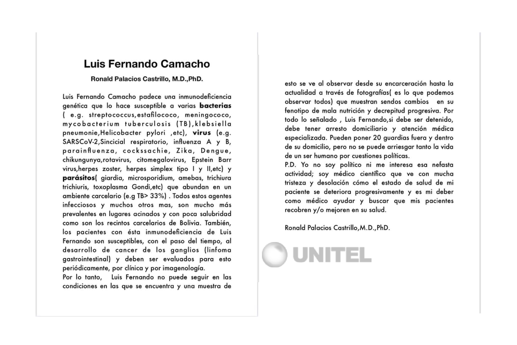“Luis Fernando Camacho padece una inmunodeficiencia genética que lo hace susceptible a varias bacterias, virus y parásitos que abundan en un ambiente carcelario. Todos estos agentes infecciosos y muchos otros más, son mucho más prevalentes en lugares hacinados y con poca salubridad, como son los recintos carcelarios de Bolivia”, señaló el galeno.