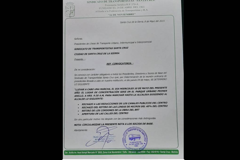 Se viene una nueva movilización. El transporte urbano alista una marcha para este miércoles 10 de mayo en rechazo al plan de ordenamiento municipal que es impulsado por la Alcaldía de Santa Cruz de la Sierra, según confirmó el secretario general del Sindicato de Transportistas de Santa Cruz, Mario Guerrero.