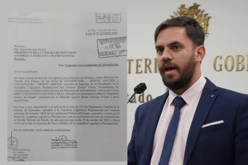 La nueva interpelación del ministro de Gobierno, Eduardo del Castillo, que estaba programada para este miércoles en la Asamblea Legislativa fue reprogramada para el 18 de octubre, según una nota firmada por el presidente nato de esta instancia gubernamental, David Choquehuanca, que fue remitida a la cabeza de la Cámara de Diputados.