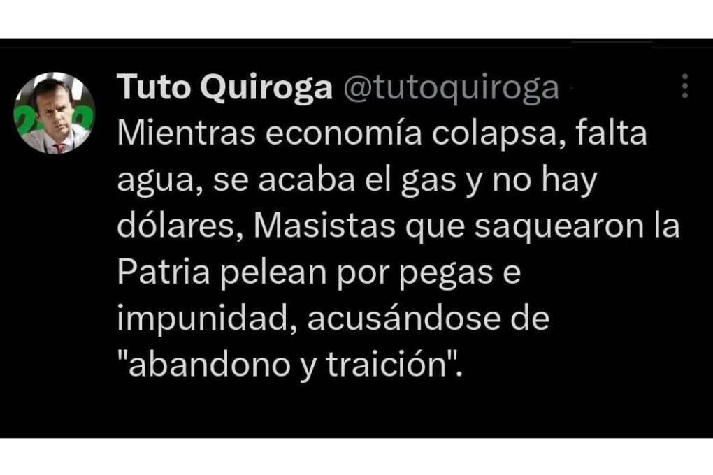 “Mientras la economía colapsa, falta agua, se acaba el gas y no hay dólares, masistas que saquearon la Patria pelean por pegas e impunidad, acusándose de abandono y traición”, señaló Quiroga en una publicación difundida en sus redes sociales oficiales.