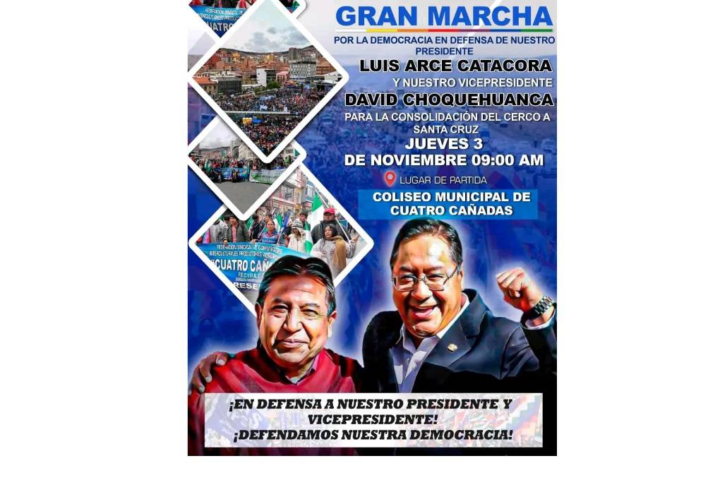 La ‘Gran marcha por la democracia en defensa del presidente y para la consolidación del cerco a Santa Cruz’ prevé concentrar en el coliseo de Cuatro Cañadas, según la convocatoria a la que tuvo acceso UNITEL. No obstante, también se prevé que se reúnan a puerta cerrada este miércoles para afinar la logística de la movilización.