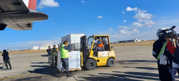 La tarde de este domingo el lote con nuevas dosis inmunización arribaron en la Fuerza Aérea de El Alto. Autoridades del Gobierno estuvieron presentes