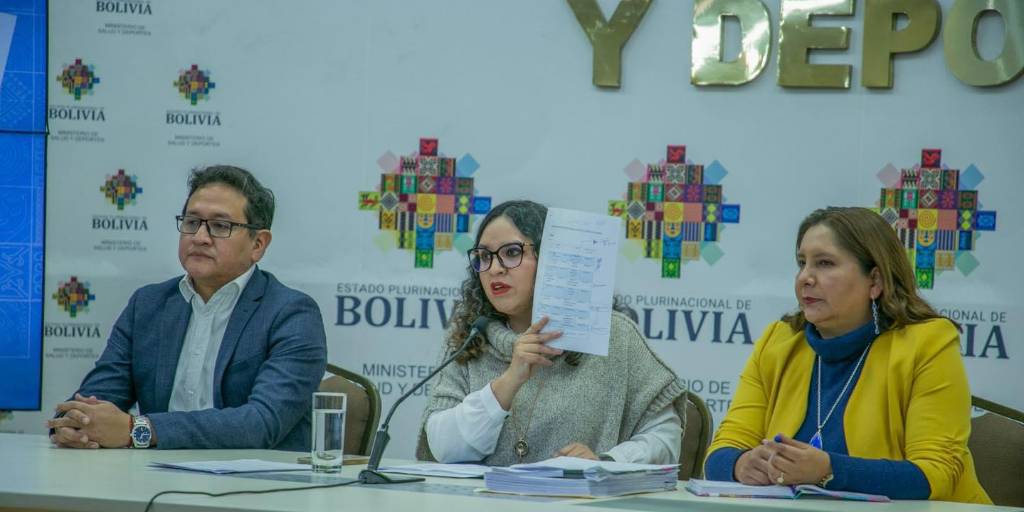 [Foto: Ministerio de Salud y Deportes ] / La ministra de Salud, María Renee Castro (centro) explica el trabajo realizado en la pandemia