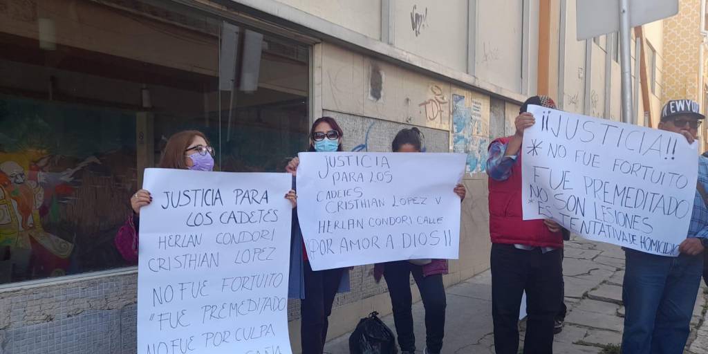 “Justicia para los cadetes”, “No fue fortuito, fue premeditado”, “no fue por culpa, fue por saña”, eran las leyendas escritas por los familiares que salieron en manifestación a puertas de la Felcc de La Paz.
