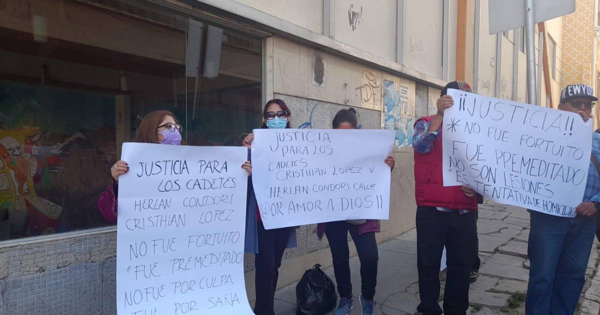 Un grupo de familiares de los cadetes heridos salió en manifestación con pancartas para exigir justicia a favor de los dos jóvenes que resultaron gravemente heridos