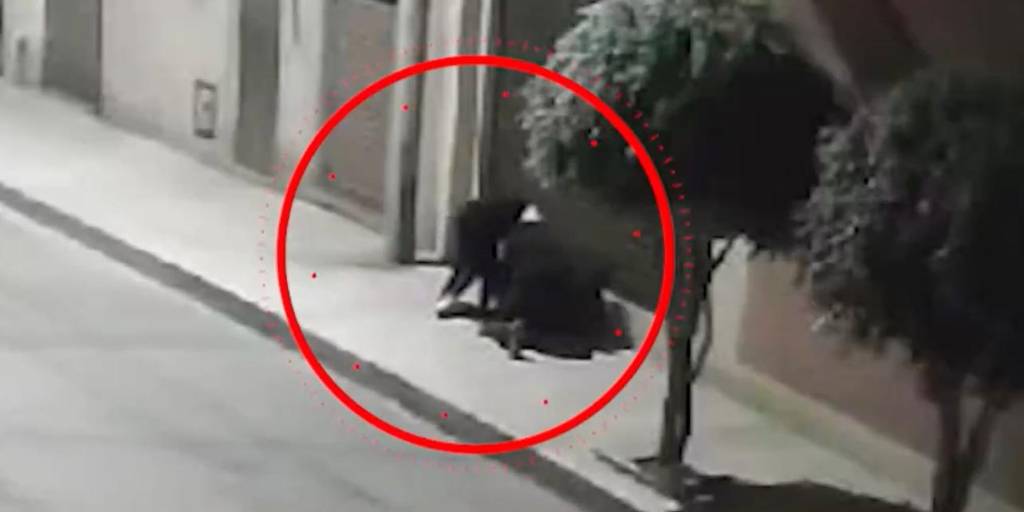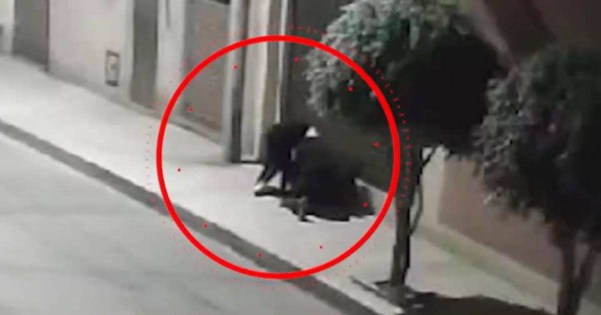 Cámaras de seguridad captaron el momento exacto en el que tres delincuentes se acercan a una persona que se encontraba sobre la calzada y estaba de espaldas a sus atacantes.
