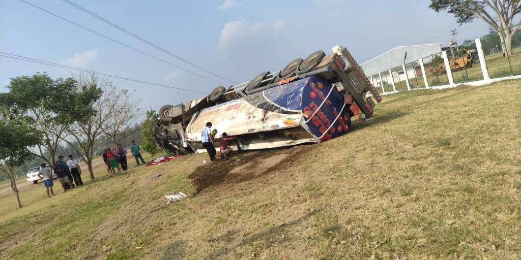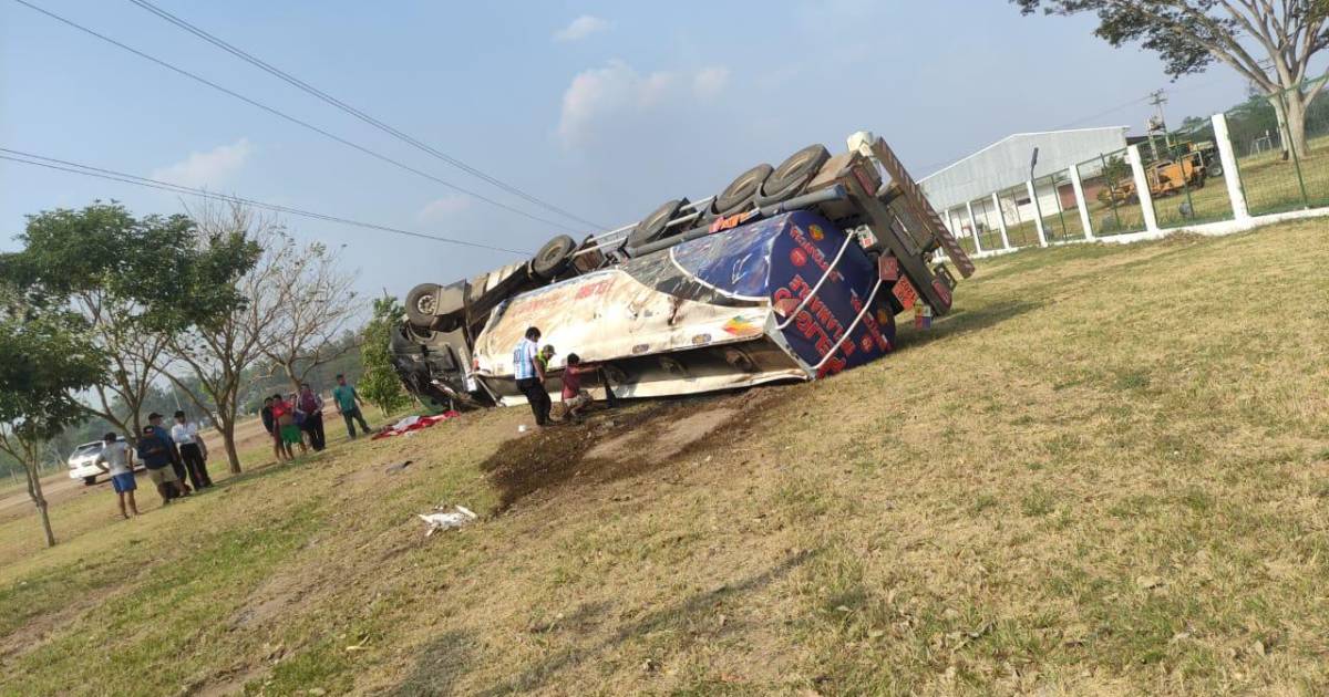 Un aparatoso hecho de tránsito se registró la pasada jornada en la ruta que une el municipio de Cotoca con Puerto Paila, Santa Cruz, en el cual un camión cisterna quedó volcado a un lado de la carretera.