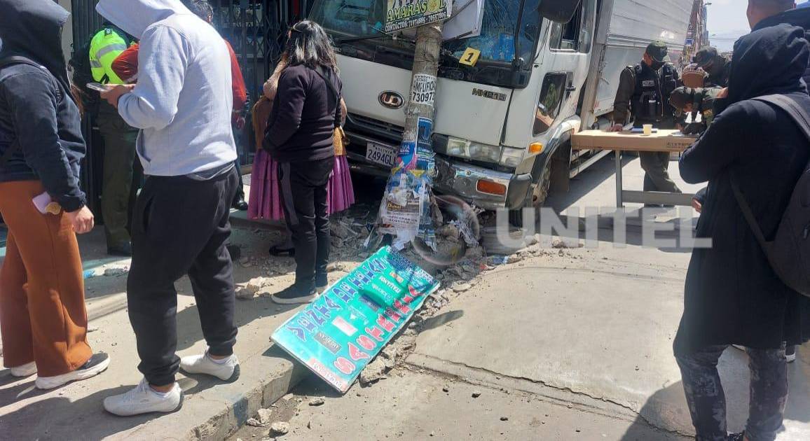 Camión sin conductor y con niños a bordo se estrella contra un poste y negocios en El Alto