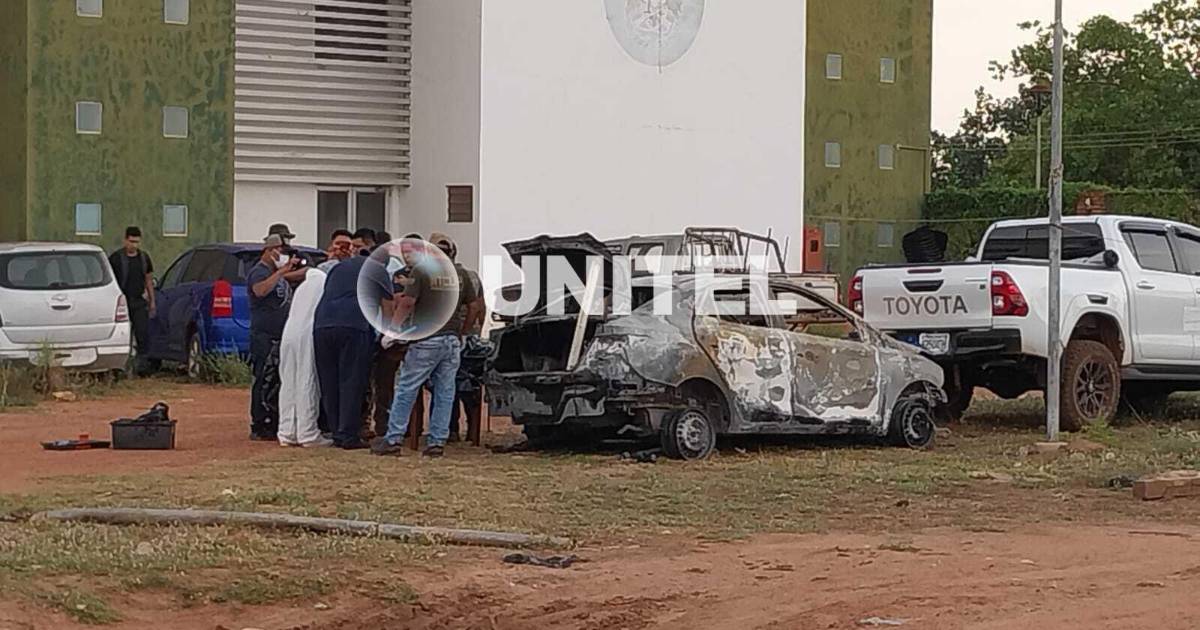 Médicos forenses y peritos del Instituto de Investigaciones Técnico Científicas de la Universidad Policial (Iitcup) de Santa Cruz, iniciaron con los trabajos de peritaje en el vehículo en el que dos personas fueron halladas carbonizadas en el municipio de San Matías.