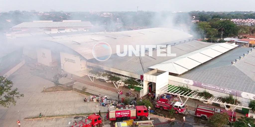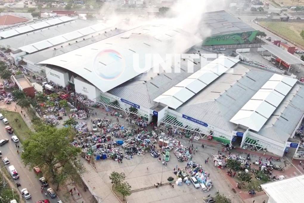 Imágenes áreas captadas por la red UNITEL muestran la voracidad de las llamas y la densa humareda que sale de los galpones y se ha expandido a gran parte de la zona.