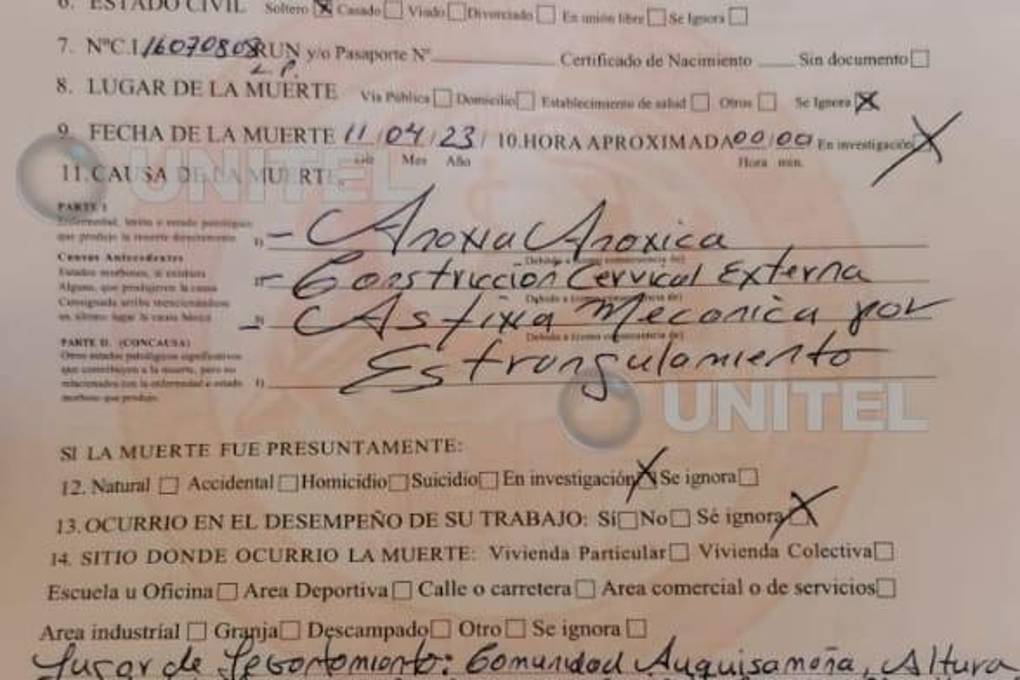 Según el informe forense al que accedió UNITEL, Yhurayma falleció por “anoxia anóxica, contrición cervical externa y asfixia mecánica por estrangulamiento”.