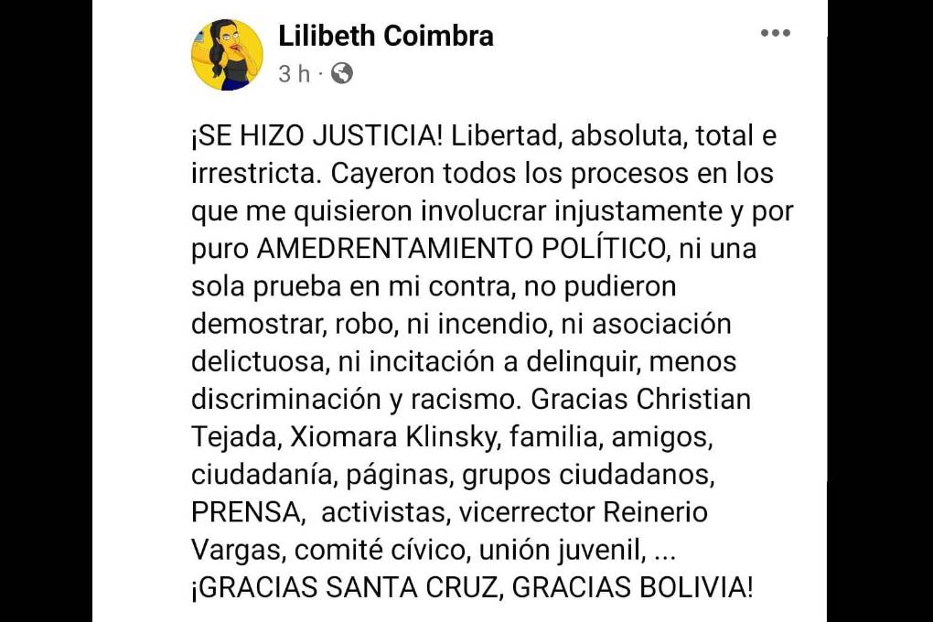 La activista cruceña Lilibeth Coimbra fue puesta en libertad este sábado, tras el falldo del juez cuatro Instrucción en lo Penal, tras ser acusada de incitar la quema de la casa del ministro de Obras Públicas, Edgar Montaño, situación que se dio a finales de diciembre de 2022, tras la aprehensión del gobernador cruceño Luis Fernando Camacho.