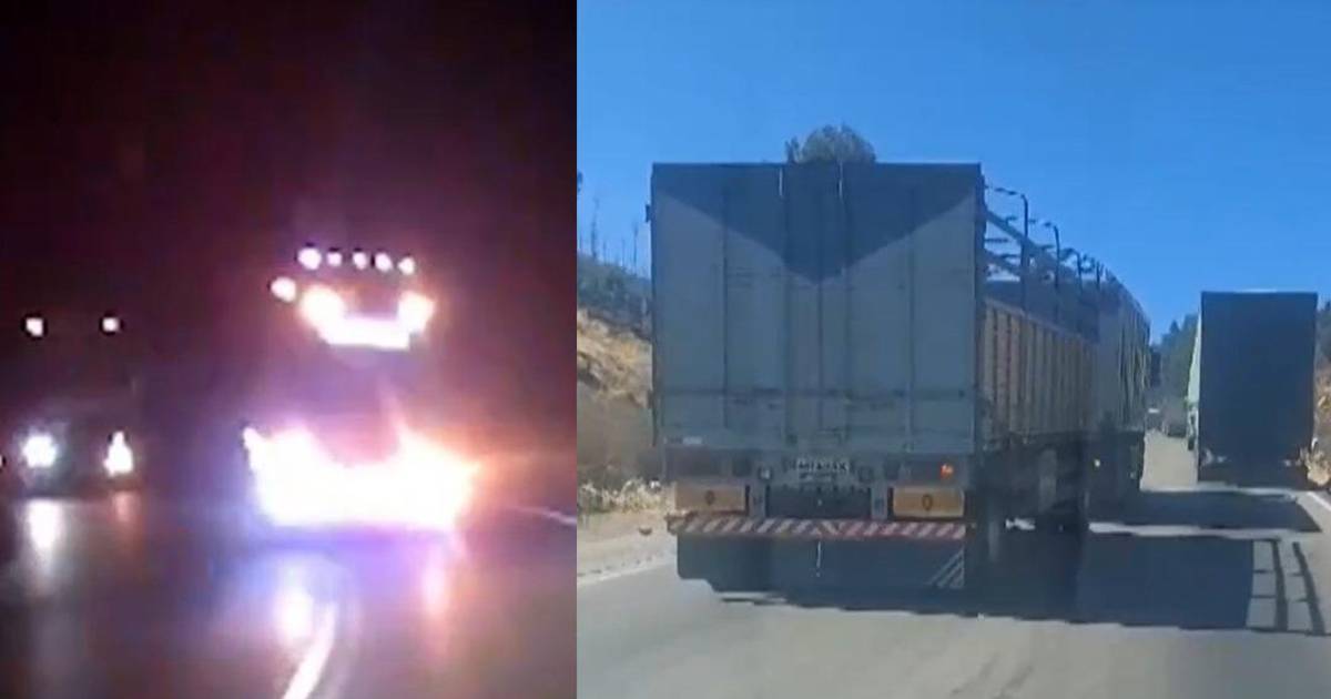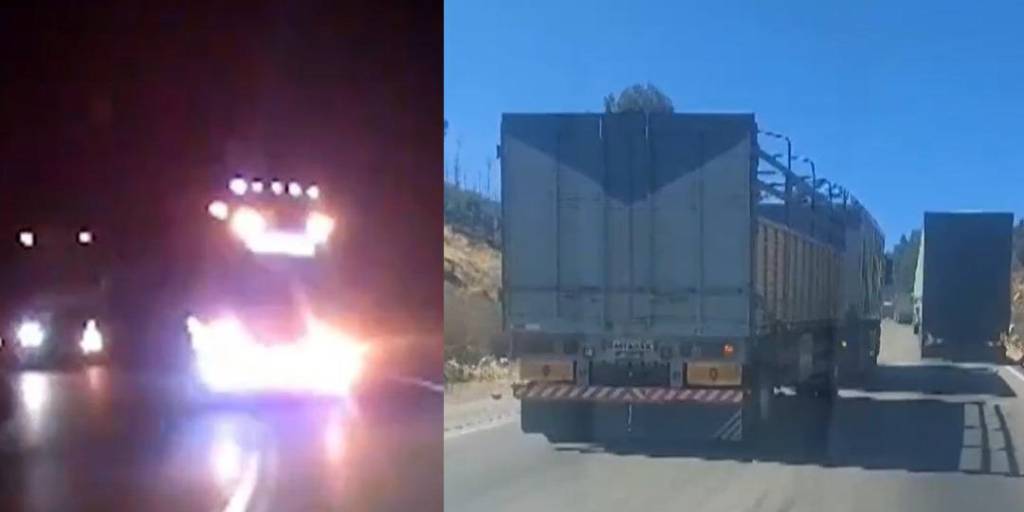 El motorizado de alto tonelaje que circulaba a gran velocidad, procede a levantarle las luces, provocando que la camioneta tenga que hacer una maniobra peligrosa y salirse del asfalto para evitar impactar de frente.