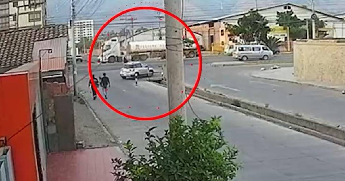 El hecho fue captado por cámaras de seguridad donde se observa como la moto desciende de una vía a gran velocidad, atraviesa la transitada avenida y termina impactando contra un costado de este vehículo de alto tonelaje.