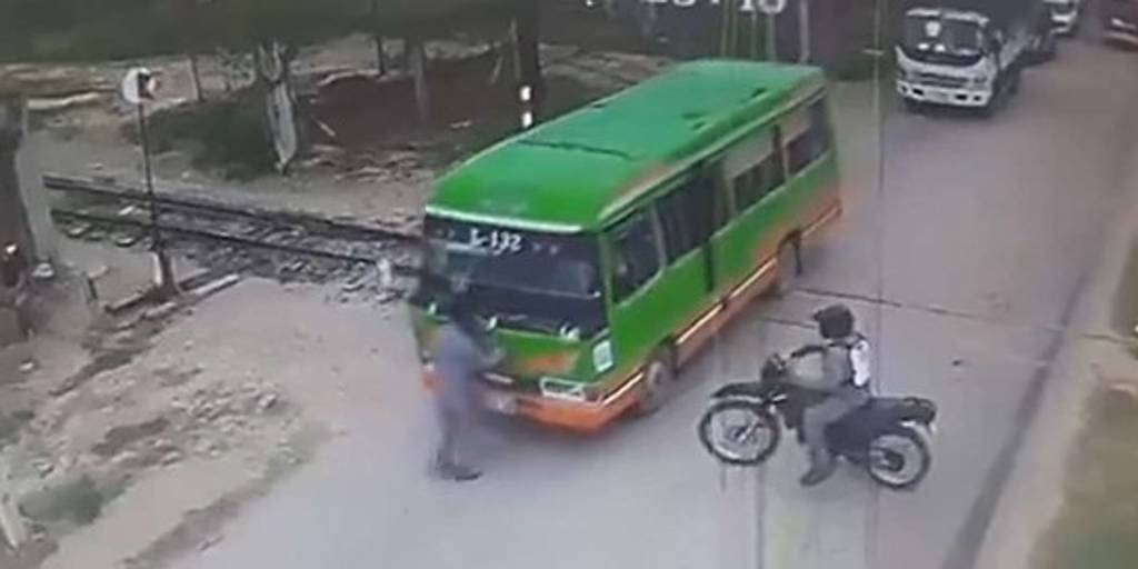 El micro casi arrolla a un funcionario de Ferroviaria Oriental y puso en riesgo a sus pasajeros. El tren pasó pocos segundos después de que el micro pasó las rieles