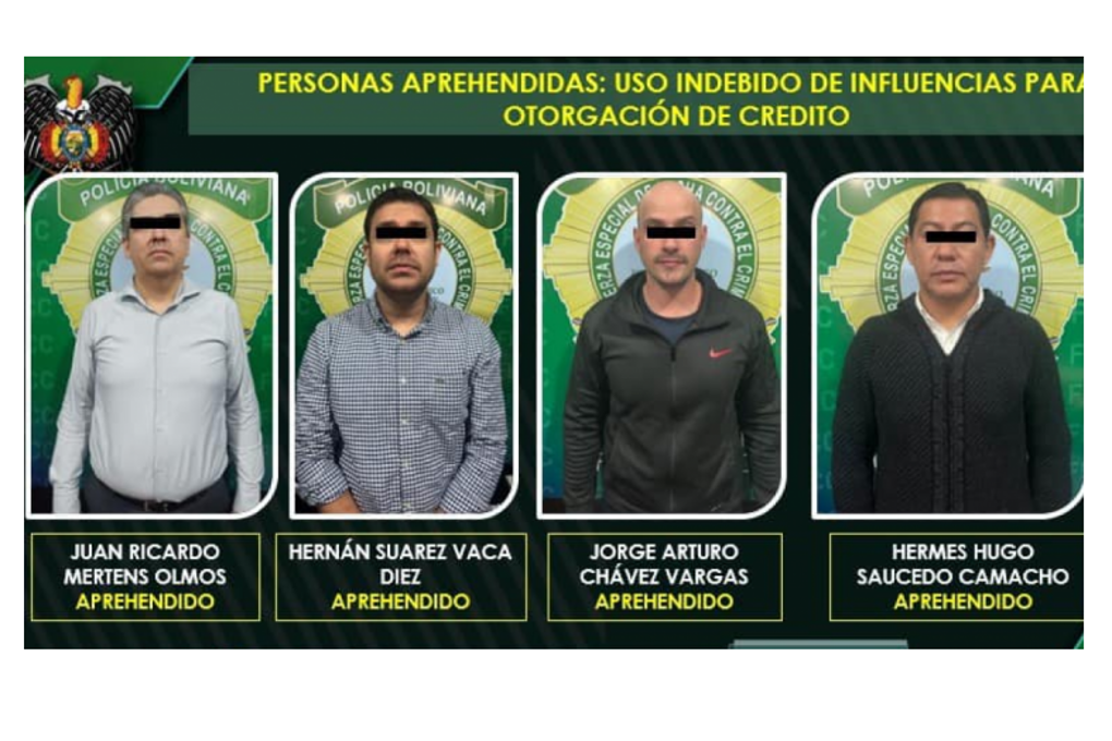 El fiscal informó que los cuatro detenidos son los primeros que fueron recluidos en Palmasola, entre los que se encuentra el presidente ejecutivo de la institución, Ricardo Mertens, así como los ejecutivos Jorge Arturo CH.V., Hernán S. V. D y Hermes Hugo S. C, a quienes se les dictó 90 días de reclusión preventiva.