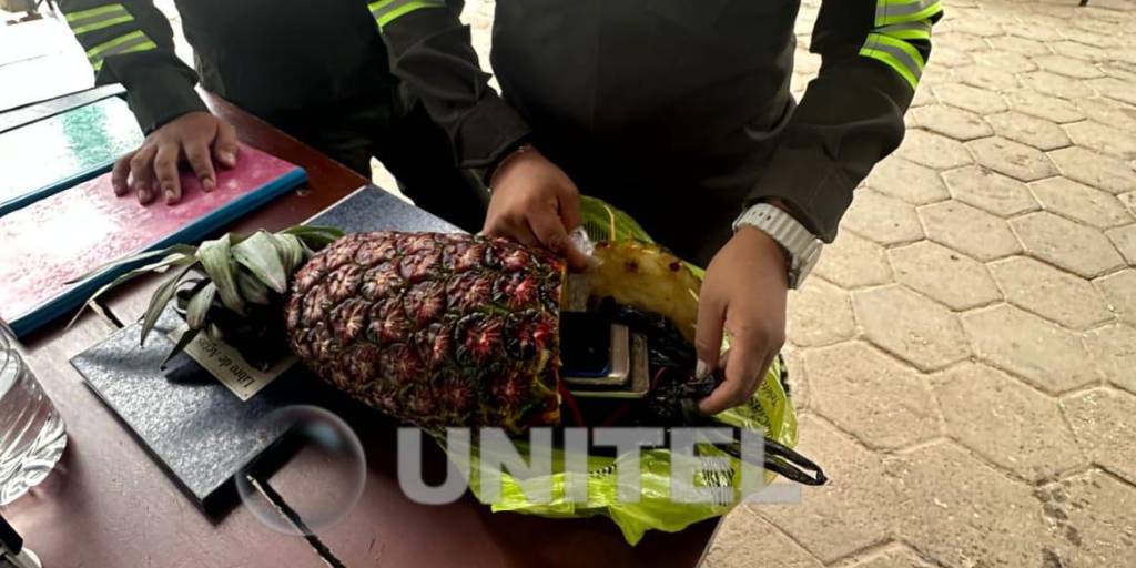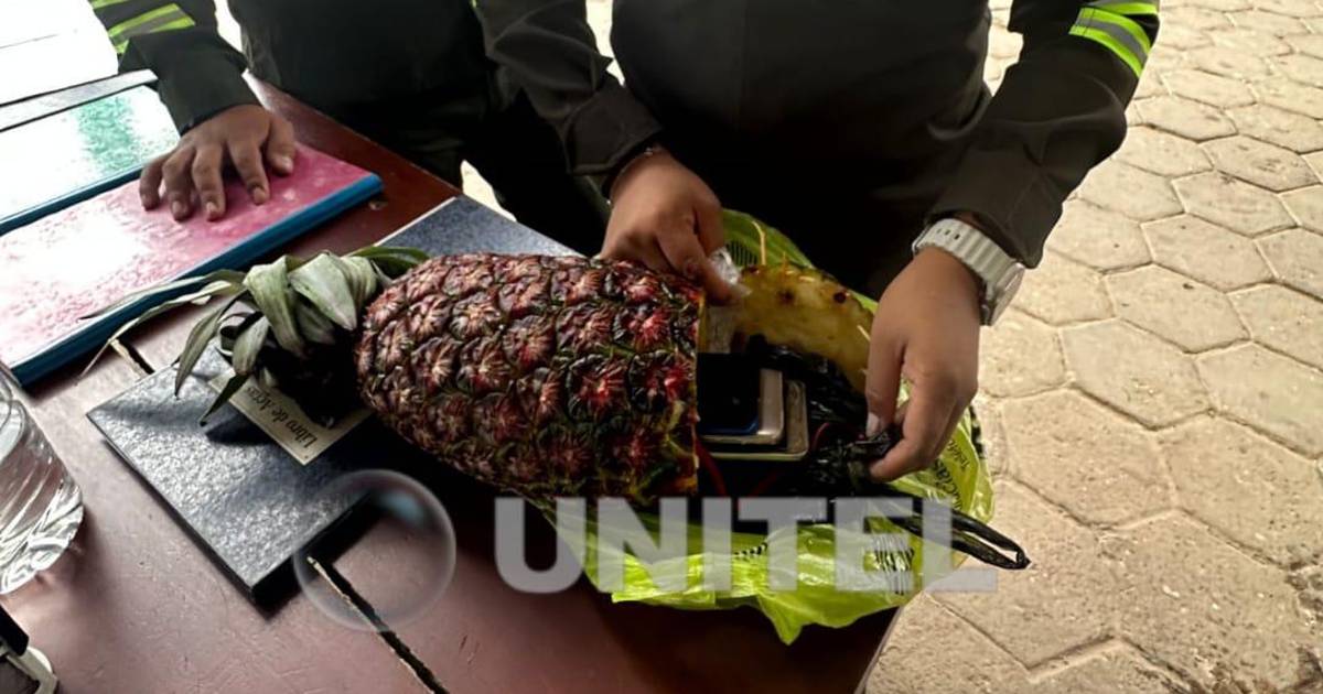 De acuerdo a las imágenes registradas en un video sobre el operativo policial se observa que algunos objetos estaban camuflados en frutas. Tal es el caso de un par de celulares que se encontraron dentro de una piña.
