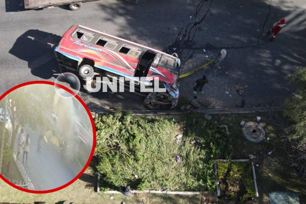 Cámaras de seguridad captaron el momento exacto en el que un trufi tipo Noah es impactado por un micro que circulaba detrás de él, provocando que este pierda prácticamente toda su carrocería.