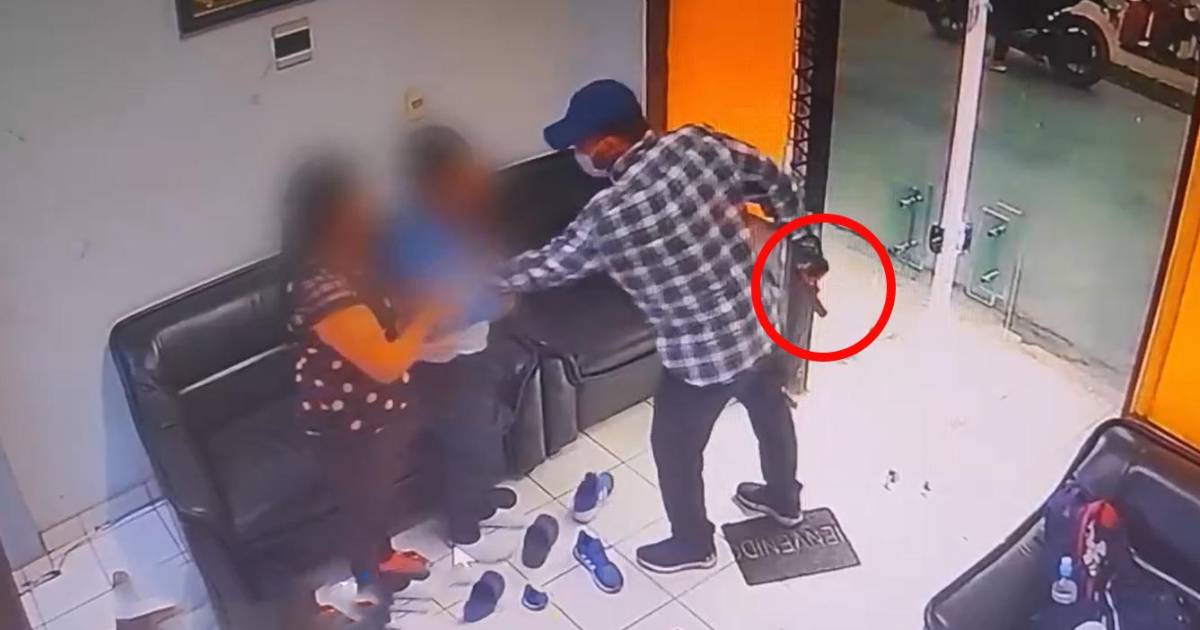 El antisocial ingresa de manera tranquila para no levantar sospecha, pero poco después saca un arma de fuego que tenía escondida entre su pantalón y amenaza a la librecambista para que le entregue sus pertenencias.