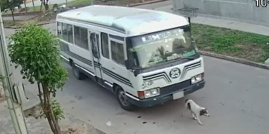 En el video registrado la mañana de este lunes se ve cómo un perro, de color blanco y negro, cruza cojeando una calle vacía en Santa Cruz. Cuando un micro de la línea 25 gira la esquina a metros del can.