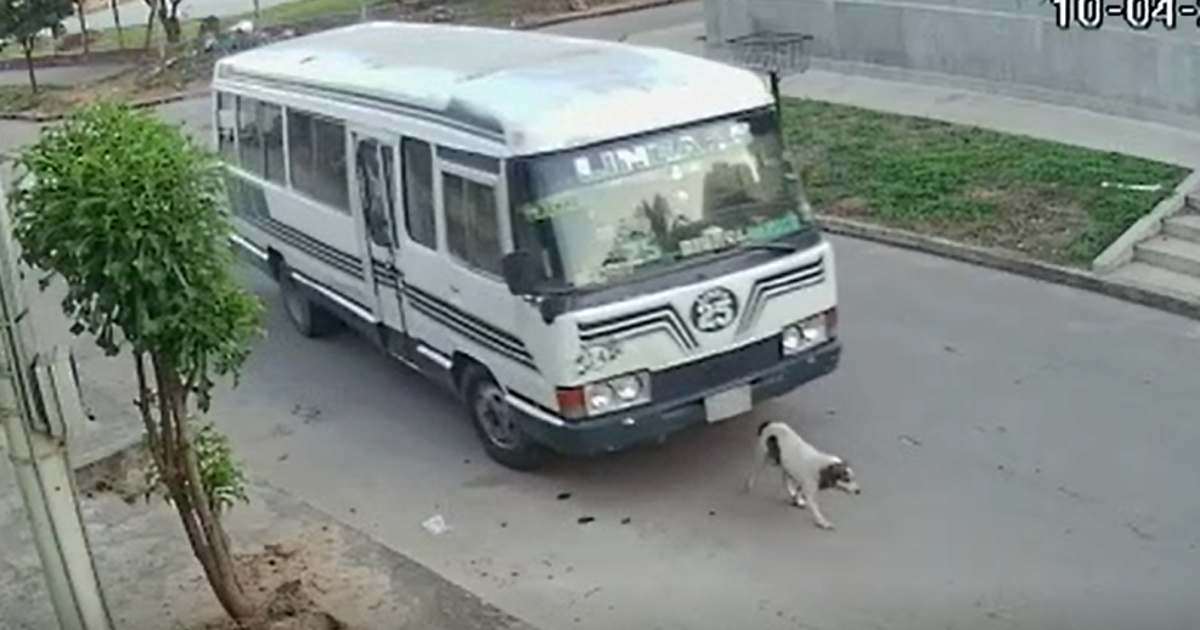 Cámaras de seguridad grabaron el momento cuando un vehículo del transporte público atropelló a un perro que estaba en la calle. En las imágenes se observa que el vehículo avanza lentamente y pasa encima del animal con las llantas delanteras y posteriormente con las traseras y posteriormente siguió su marcha.