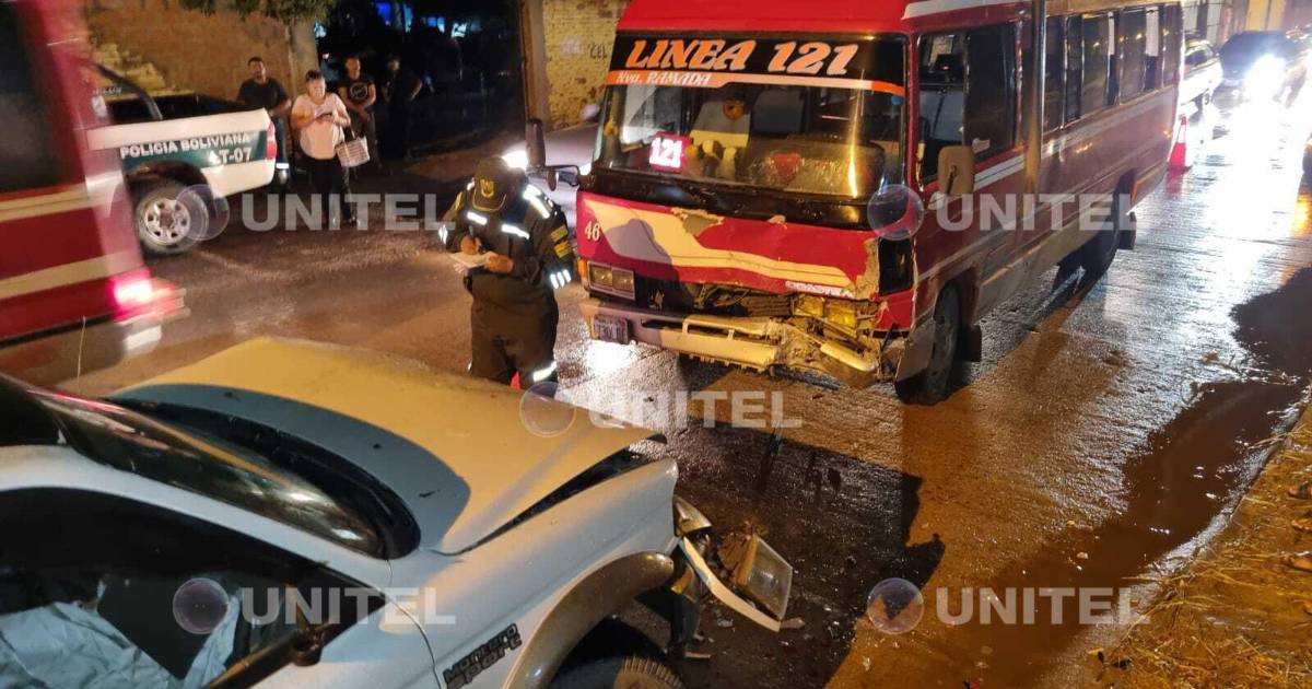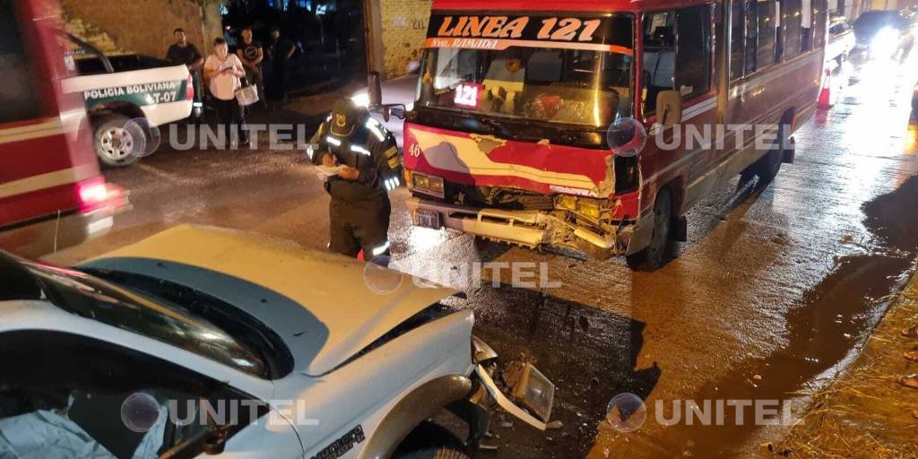 La noche de este martes, un micro de la línea 121 impactó contra un vehículo blanco en la zona de la urbanización España en el sexto anillo de la ciudad de Santa Cruz de la Sierra.