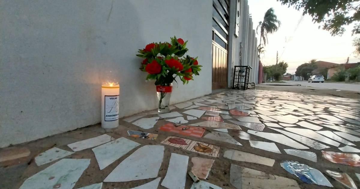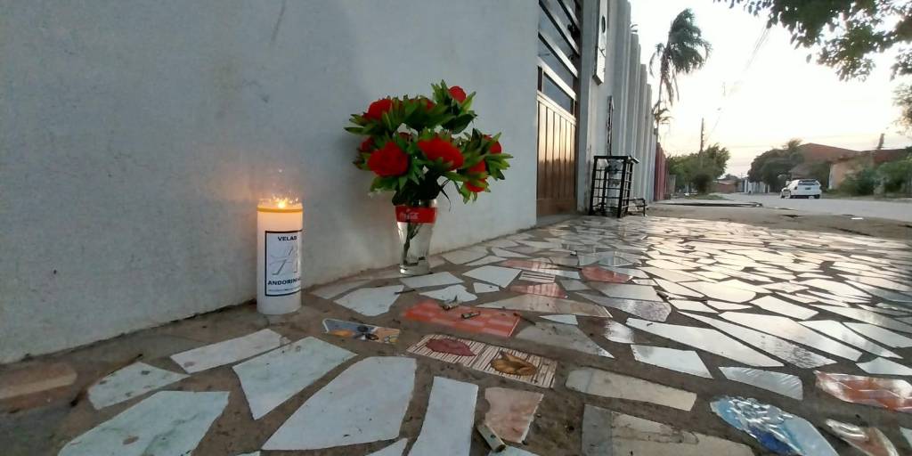 Un ramo de flores y una vela encendida es lo que se ve en la puerta del domicilio donde una mujer de 56 años fue asesinada por su hijo de 30 años, sujeto que tras cometer el crimen cerró el inmueble con llave y se fue del lugar para más tarde intentar asesinar a su pareja en la zona de la Mutualista, en la capital cruceña.