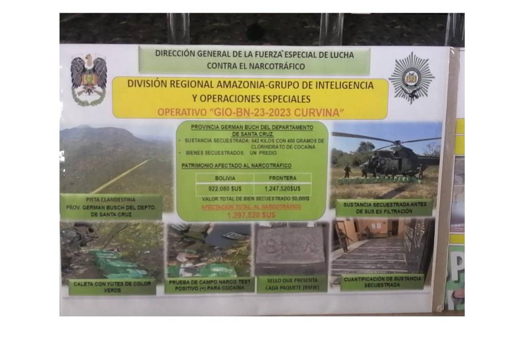 Después de que la Fiscalía y la Fuerza Especial de Lucha contra el Narcotráfico (Felcn) ejecutó un operativo antidroga en una propiedad ubicada entre los municipios de Roboré y Puerto Suárez, desde el Ministerio de Gobierno confirmaron que el volumen de la droga incautada asciende a 542 kilos, labor que significó un golpe al narcotráfico de casi $us 1,3 millones.