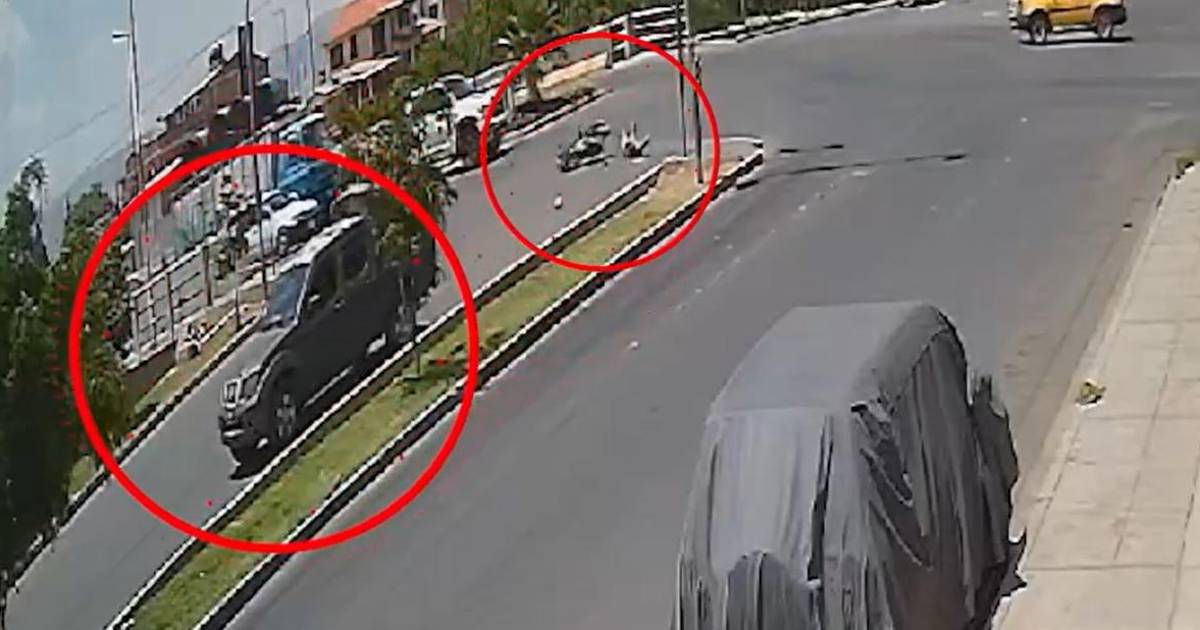 Cámaras de seguridad de la zona de la avenida Beneméritos del Chaco y Juana Azurduy, en la ciudad de Cochabamba, captaron cuando un motociclista es embestido por una camioneta.