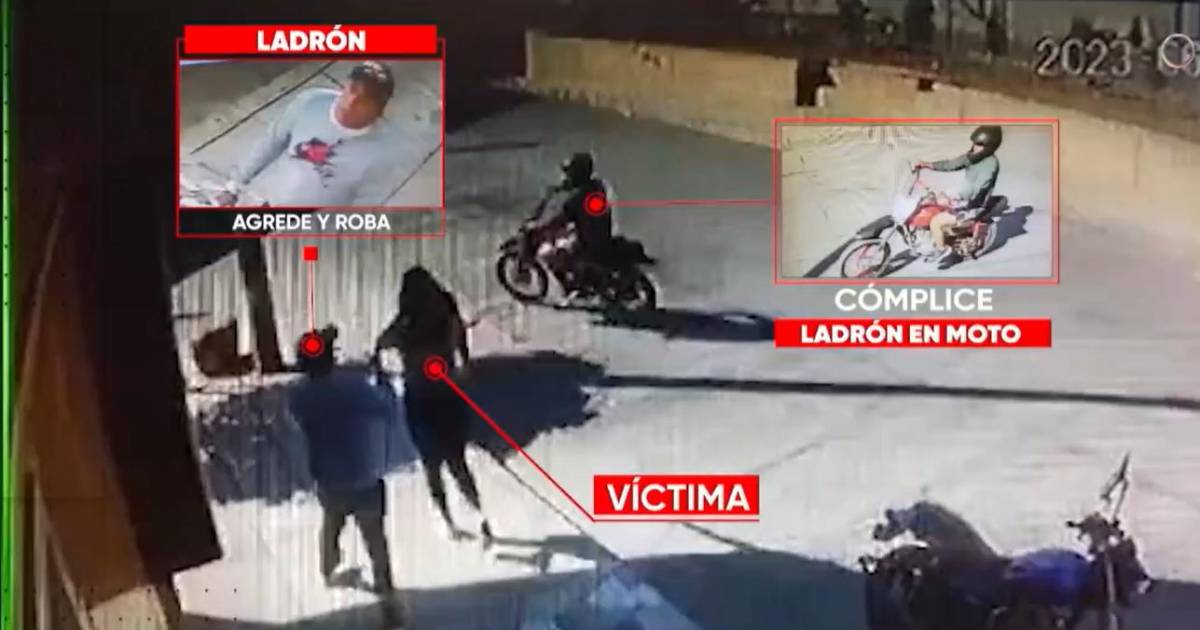 Las imágenes revelan el momento en el que un sujeto que caminaba por detrás, acelera su paso para acercarse a la joven, mientras que sobre la vía se ve a un motociclista captando todo el movimiento.