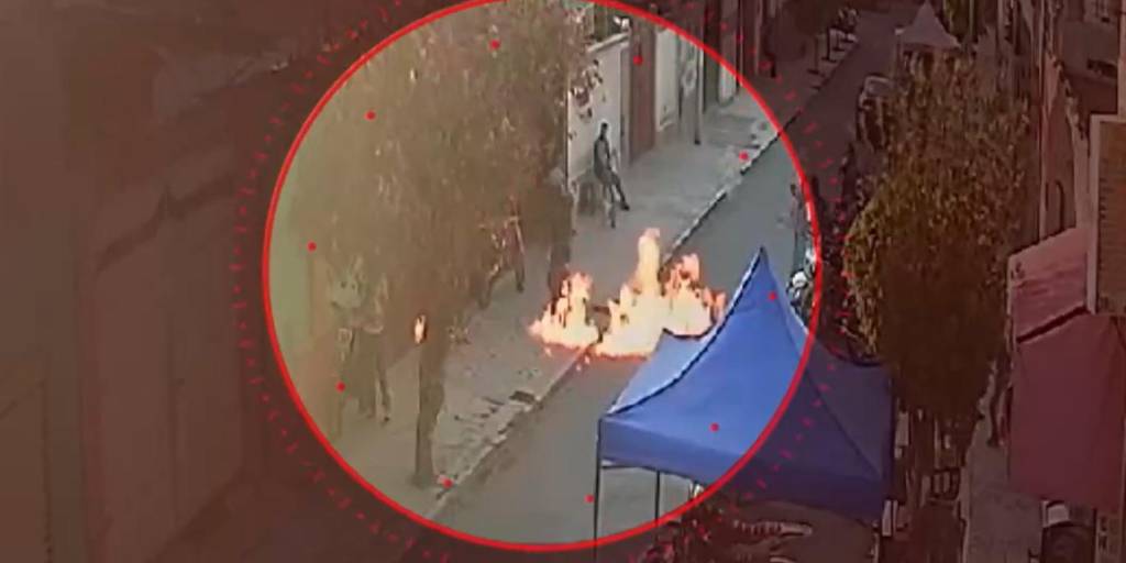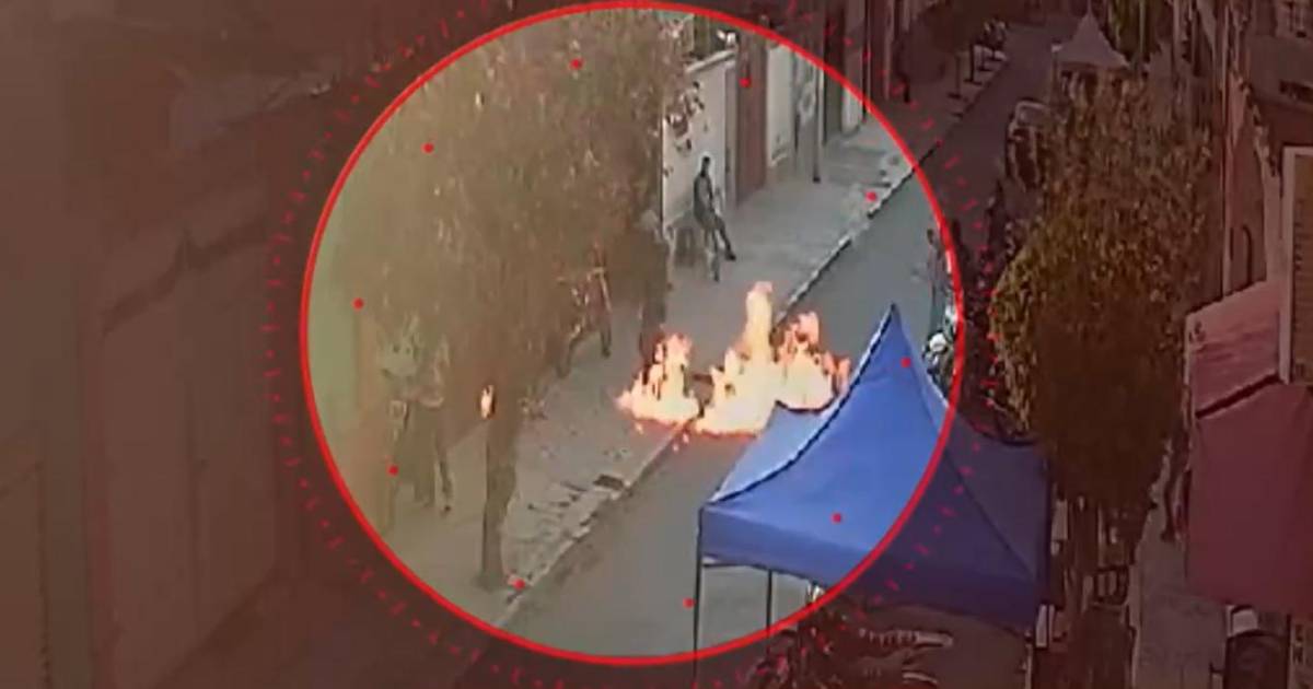 Una cámara de seguridad captó el momento exacto en el que una madre circula por la calle acompañada de sus dos hijos cuando son sorprendidos por una enorme llama que sale con fuerza del interior de un negocio y cae sobre la vía.