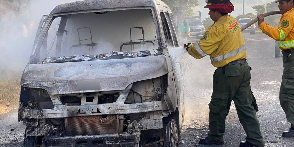 Un minibús, que se trasladaba desde la ciudad de Sucre, ardió completamente en plena avenida Doble Vía a La Guardia, a la altura del kilómetro 15, en Santa Cruz.
