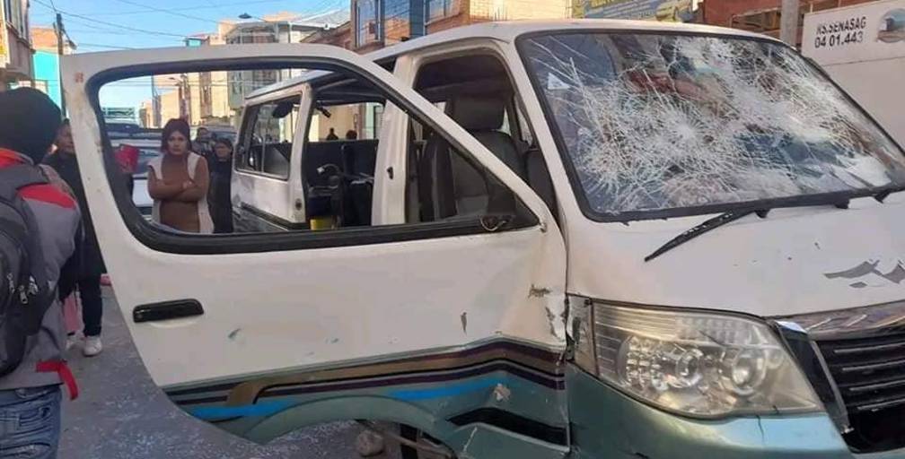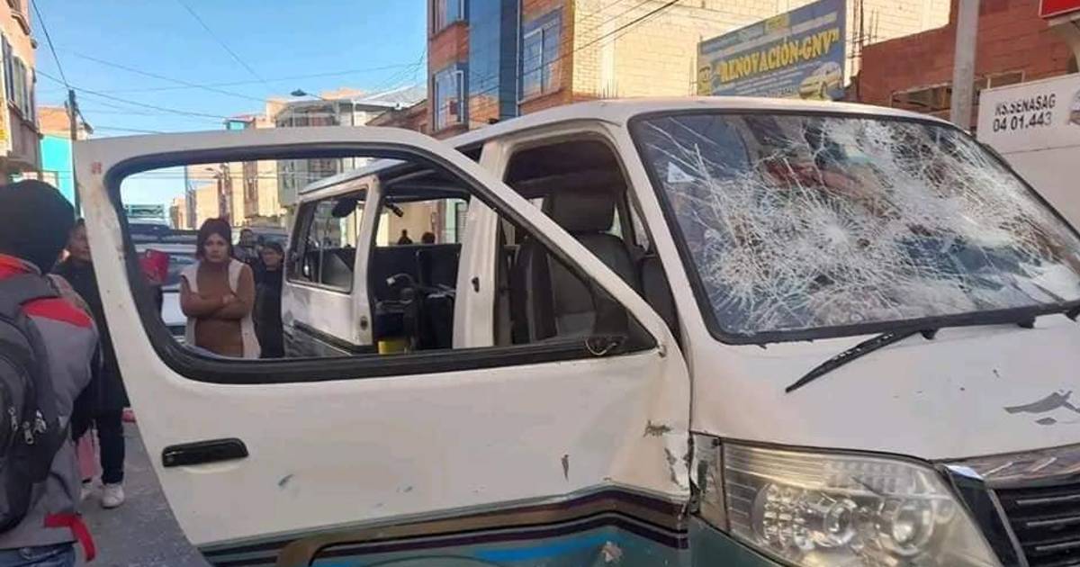 [Foto: Voz Digital El Alto ] / Un minibús terminó con los vidrios rotos y las puertas destrozadas