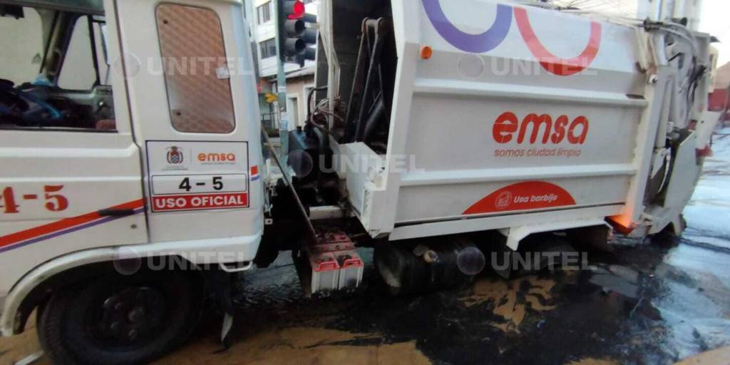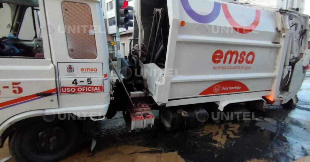 La mañana de este viernes el asfalto de una calle del centro de la ciudad de Cochabamba cedió y la llanta trasera de un carro basurero de la Empresa Municipal de Aseo (EMSA) quedó atrapada.