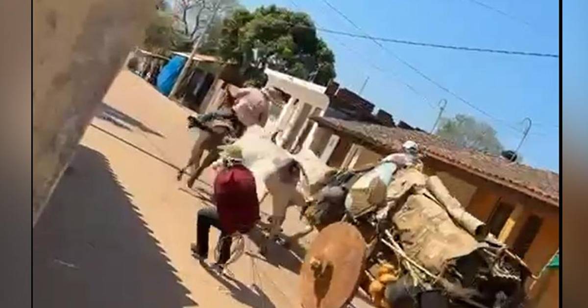 En redes sociales circula el momento en el que los bueyes se descontrolan y arremeten contra dos personas que quedaron golpeadas por los animales