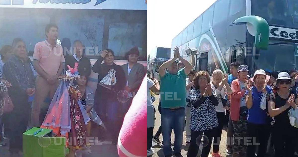 Los viajeros también transportan una imagen de la Virgen de Urkupiña, a quien oran para que el conflicto se solucione y puedan llegar a sus destinos.