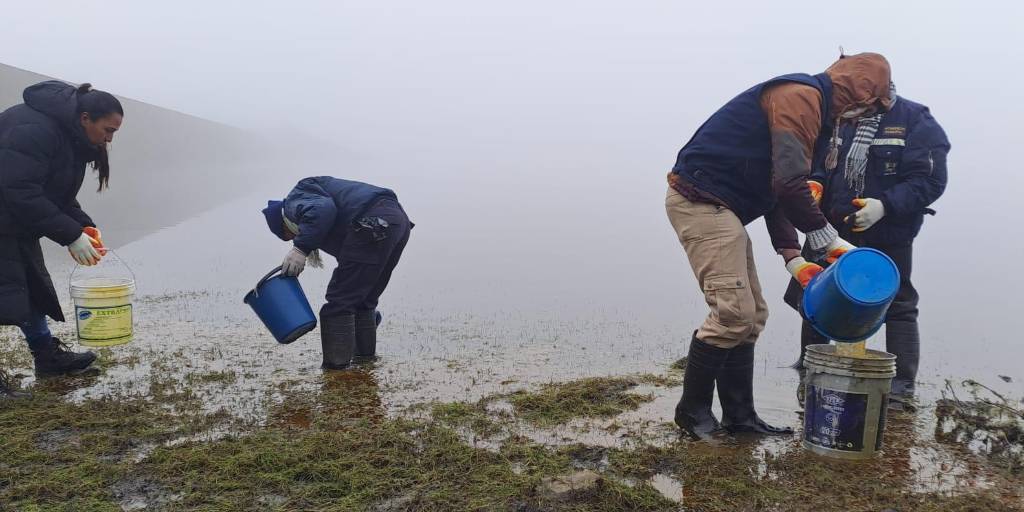 Chofer de cisterna que derramó aceite en la laguna Corani ayuda con los trabajos de limpieza