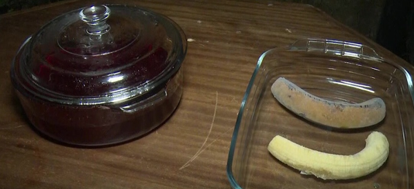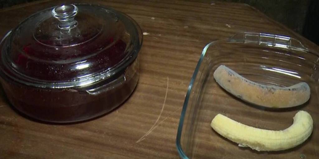 Como parte de la experiencia se lavó una prenda de vestir y se la colgó en el tendedero, luego se preparó una gelatina y se la dejó al aire libre, además, se colocó una banana pelada y otra con su cascara sobre un recipiente; todos los objetos fueron dejados a la intemperie pasando ahí la noche.