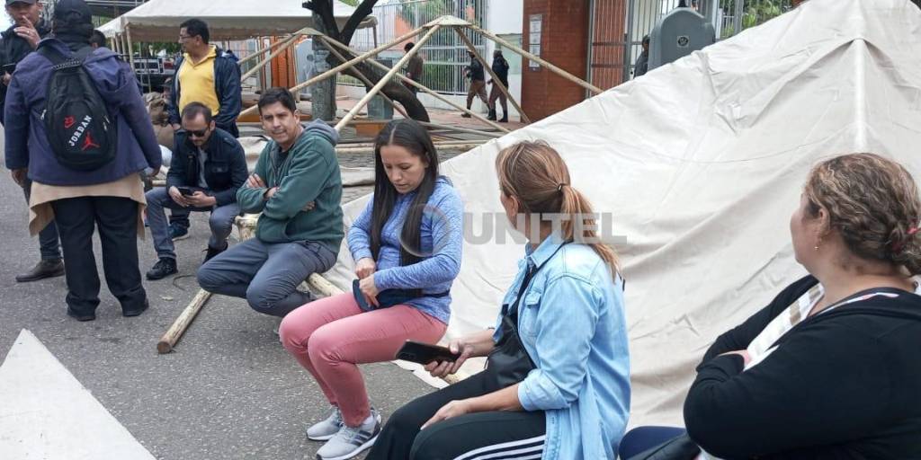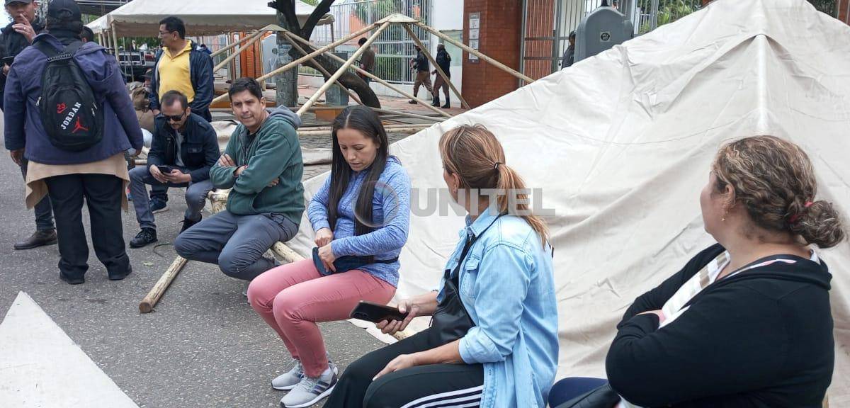 Los movilizados se instalaron cerca de los toldos y algunos se sentaron para evitar que los trabajadores continúen trabajando en el lugar.