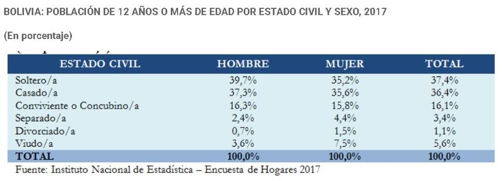 En Bolivia, según datos generados en 2017 por el Instituto Nacional de Estadística (INE) en una encuesta de hogares, por cada 100 hombres, 40 están solteros.