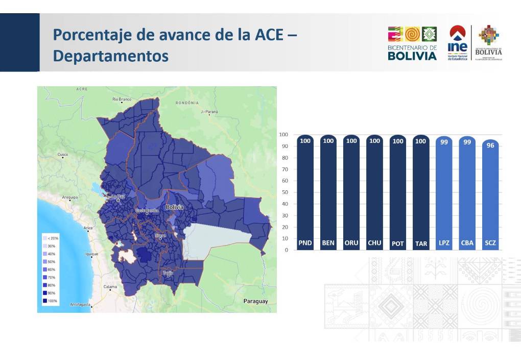 Arandia explicó que el departamento de La Paz se encuentra al 99% de avance de la ACE, Cochabamba está también al 99% y Santa Cruz registra un 96%. En tanto, Pando, Beni, Oruro, Chuquisaca, Potosí y Tarija cerraron la ACE al 100%.