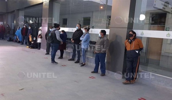Más de una veintena de personas hace fila en las puertas del Hospital del Norte de Cochabamba a la espera de recibir la segunda dosis de la vacuna Sputnik V.