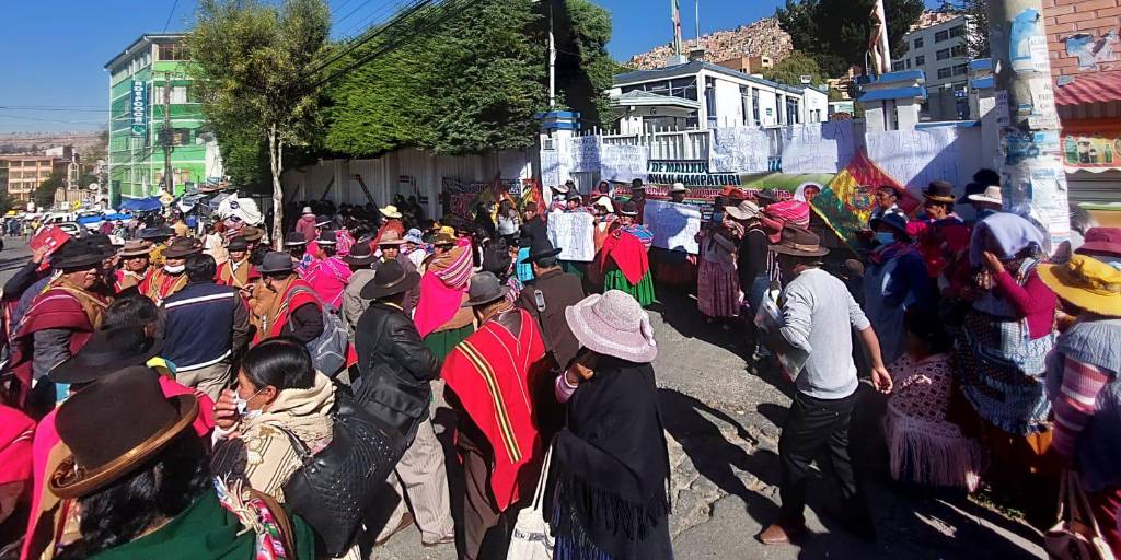 La protesta se instala en puertas de la oficina central de la empresa de aguas de La Paz. Las denuncias apuntan al interventor de la empresa, Vladimir Iraizos, a quien responsabilizan de un presunto incumplimiento de proyectos referidos a riego y agua potable.