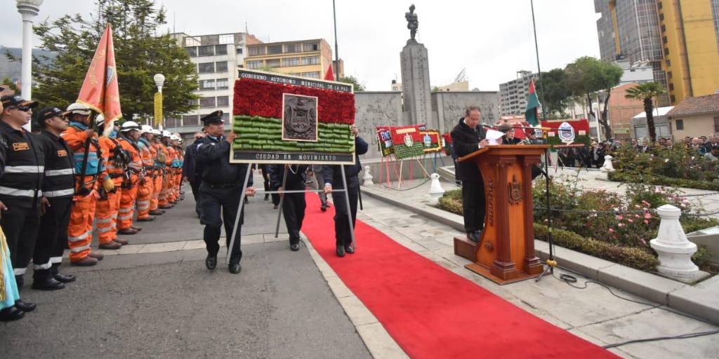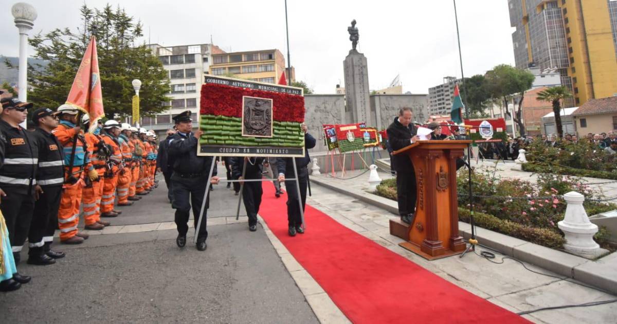 Como es costumbre, los actos cívicos se realizaron en la Plaza Alonso de Mendoza con la entrega de ofrendas florales y la iza de la bandera paceña.