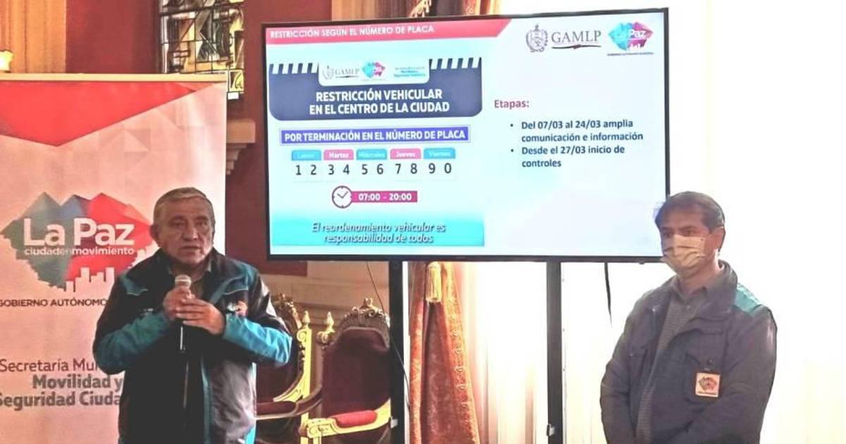 El alcalde de La Paz señaló que la restricción se aplicará de lunes a viernes de 07:00 a 20:00. “Vamos a sacar del parque automotor 27.000 vehículos que no van a circular por día, entre públicos y privados”, señaló el alcalde de La Paz.